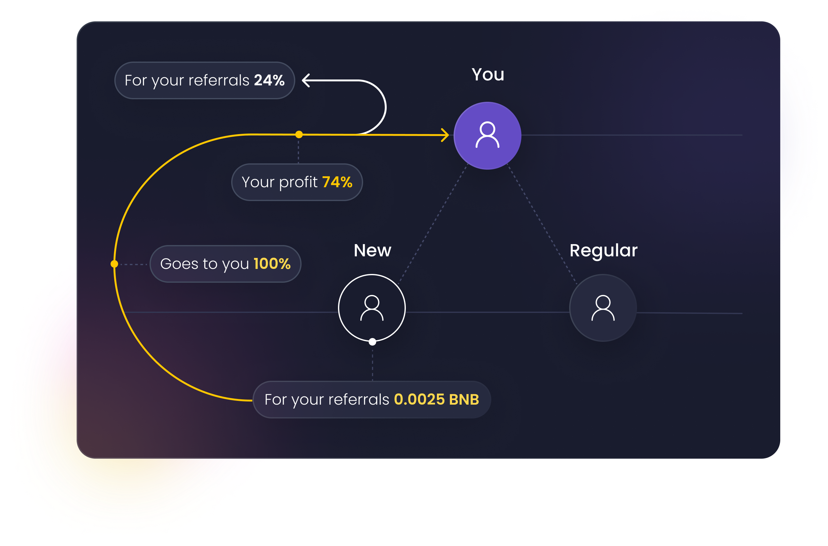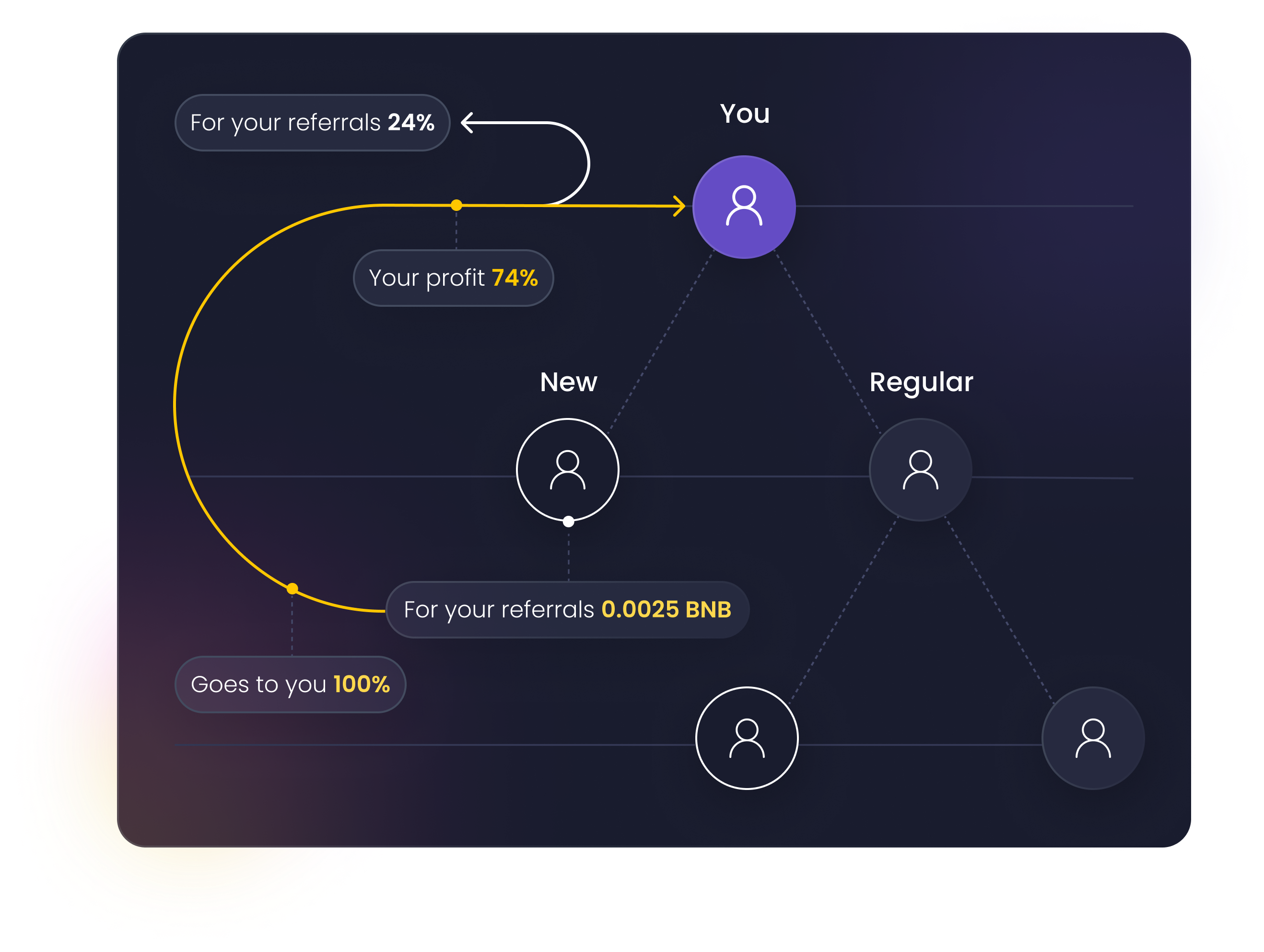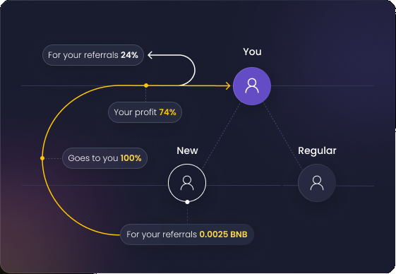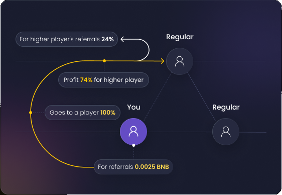 Each reward from a lower player is divided into 2 parts: 76% of the profit goes to a higher player in your cycle, and the remaining 24% goes to reward him with a referral.